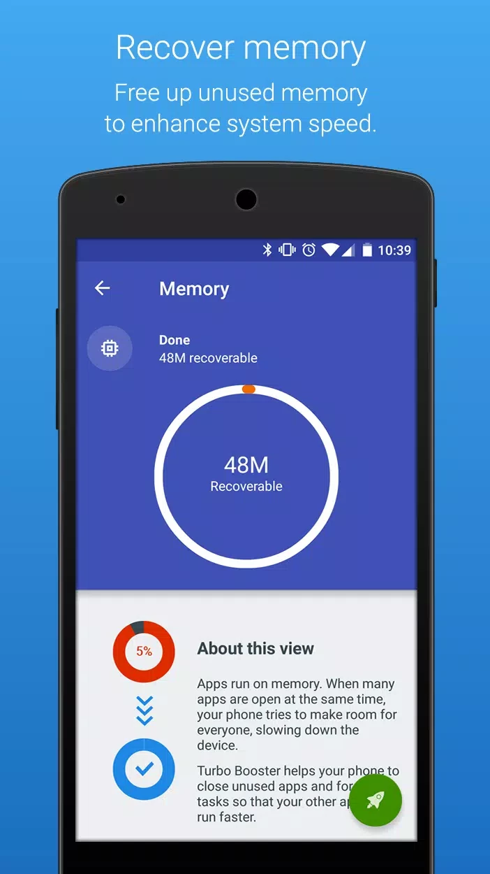 Turbo Booster, Android telefonunuzu temizlemeye, optimize etmeye ve hızlandırmaya yardımcı olan hepsi bir arada bir yazılımdır. Cihazınızdaki istenmeyen gereksiz dosyaları çok hızlı bir şekilde tespit edip silerek, diğer önemli görevler için RAM belleğini boşaltır. Diğer önemli faaliyetlerinize müdahale etmeden cihazınızın performansını yönetmek için arka planda çalışır.